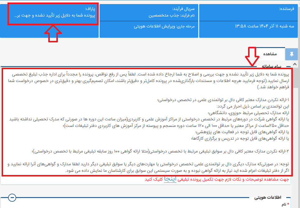 داوطلب گرامی، در صورتیکه پیامک نقص پرونده برای شما ارسال شده است، توجه فرمایید که نواقص اختصاصی پروندهتان در ابتدای صفحهی مربوط به پرونده، توسط کارشناسان اداره جذب درج شده است.
